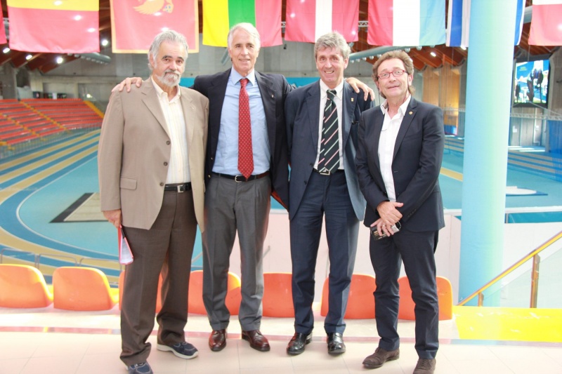 Giuseppe Scorzoso (presidente FIDAL Marche), Giovanni Malagò (presidente nazionale CONI), Fabio Sturani (presidente CONI Marche), Roberto Buccione (progettista del palaindoor di Ancona)